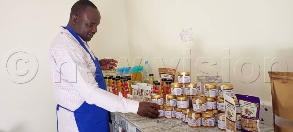LEAD PHOTO CAPTION: Julius Bigabwa, the owner of Biglad Organic Training Centre in Kanyambeho, Fort Portal showing some of the products he makes from macadamia. Photo by Umar Nsubuga
