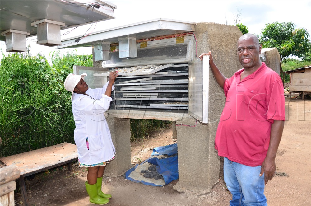 LEAD PHOTO CAPTION: Sheila Kanyarusoke (left) inserting sliced cassava on trays in a solar drier, as Professor Kant Kanyarusoke (right) look on.