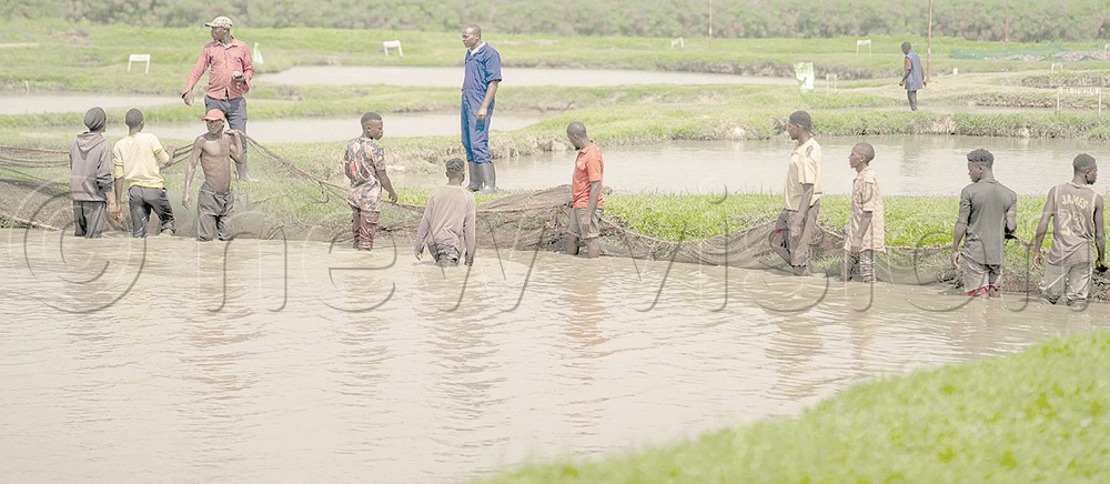 LEAD PHOTO CAPTION: Former street boys turned fi sh farmers harvesting fi sh in Masheda’s ponds in Buyala on Mityana Road.