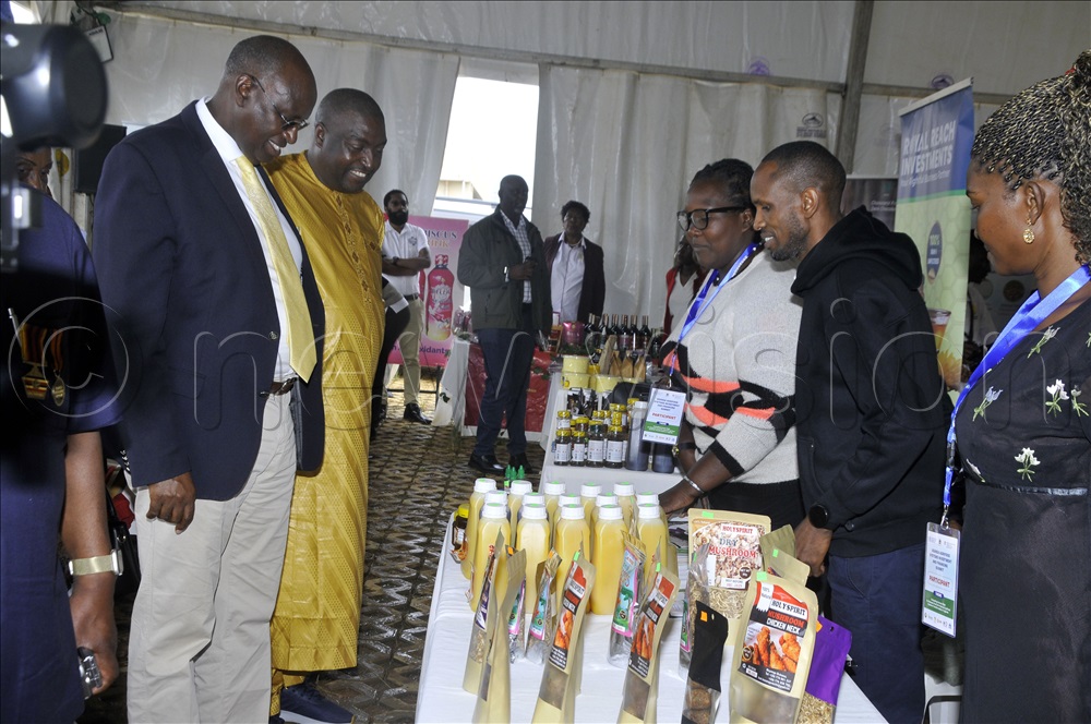 LEAD PHOTO CAPTION: Bright Rwamirama State minister for agriculture inspects stalls at Uganda Agrifood system Investment and financing summit, Namanve June 24, 2025. (Photo by Wilfred Sanya)
